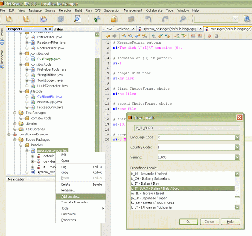 Then, let’s say you want to create the Italian version, it’s simply a matter of right-clicking on the properties file and selecting “Add Locale,” either choosing from the list a ‘pre-cooked’ language/country/variant or choosing freely from the drop-down lists.