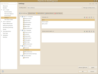 Note for the curious: the additional libraries listed there are for Google C++ Unit testing framework, GUnit, available here – you will have to build it, but that’s pretty straightforward, resulting in the two libgtest.a and libgtest_main.a libraries – be careful to add those only to your ‘Test’ configuration and exclude your unit tests from build in your Release/Debug configurations.