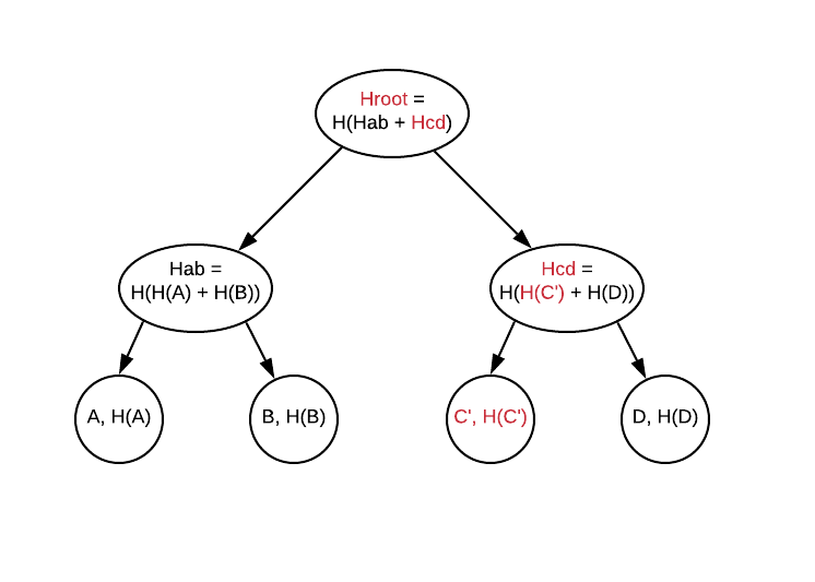 merkle::Build(), which we’ll see in a second, and the data is stored in the tree’s leaves: if we were using this in a similar fashion as Bitcoin’s blockchain, we would only have to transmit the root’s computed Hash (alongside, obviously, the data contained in thenodesvector): the receiver could usemerkle::Build(nodes)similarly, and then compare its own computed root hash with the received one and thus validate the received data against tampering.
